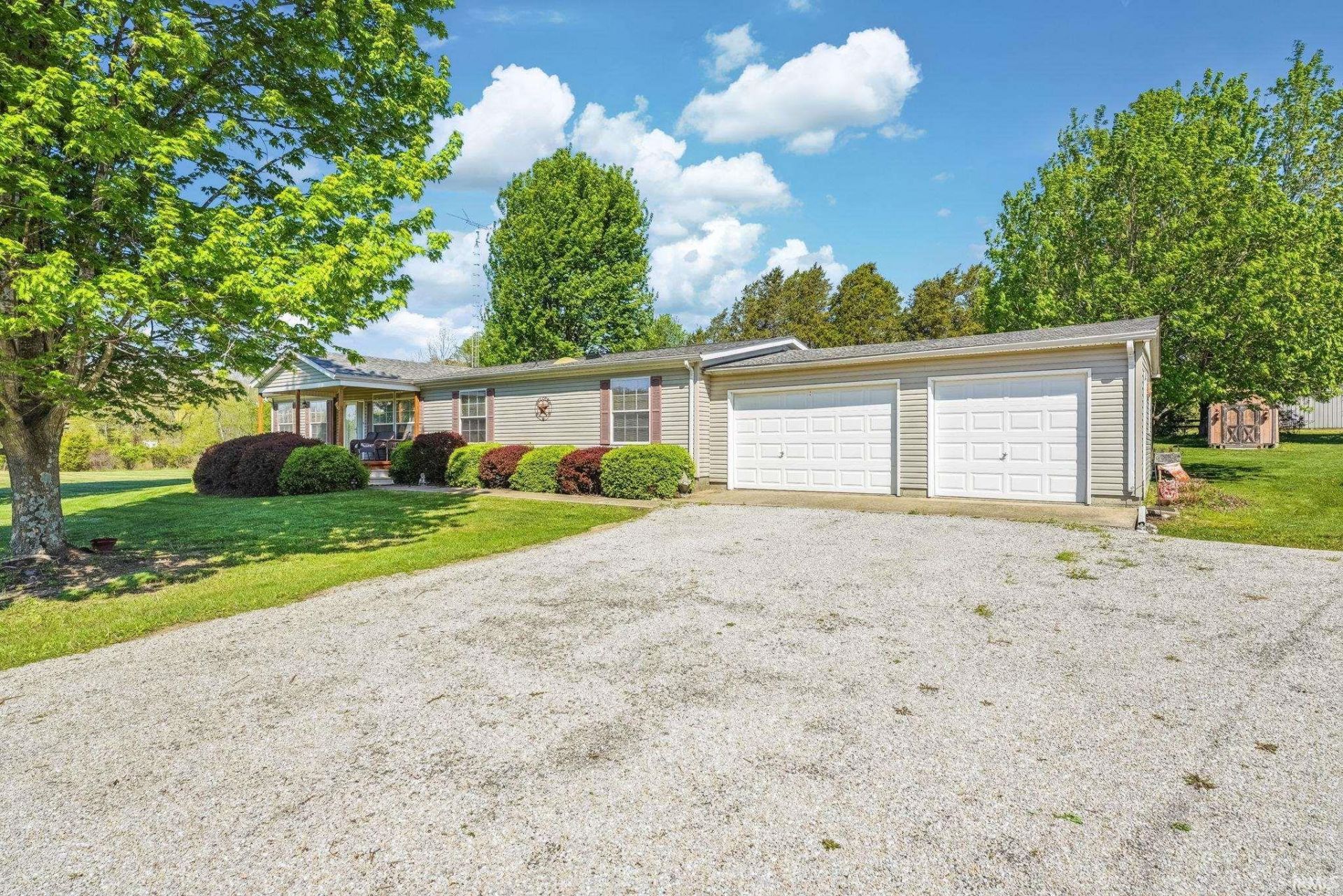 Enjoy the space and flexibility this property has to offer! Situated on 7.32 acres in the rolling hills of Jackson County, this manufactured home features 3 bedrooms, 2 full bath, and an attached 2-car garage. The property includes multiple outbuildings, including three sheds and a barn equipped with four horse stalls ideal for a variety of uses such as storage, hobbies, or livestock. A pond adds to the setting and provides additional outdoor enjoyment. Take in the scenic surroundings from the front porch, offering a peaceful spot to relax and enjoy the views of the surrounding countryside. With a mix of open ground and natural landscape, there is plenty of room to spread out and make the property your own. New roof in 2024. Home Warranty Included.